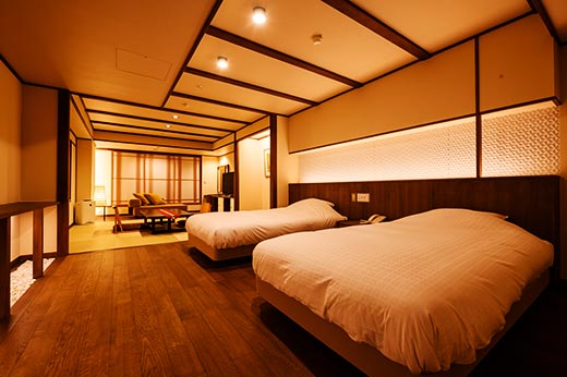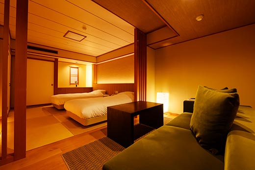 Tamaya Ryokan's cozy guest rooms are designed for ultimate relaxation. Choose between Western-style rooms that feature beds and Japanese-style rooms furnished with traditional futons. For the Western-style rooms, you can choose between three types—Suite, Semi-Suite, and Standard—each varying in size and amenities. All rooms come equipped with toilets and baths and are strictly non-smoking. Smoking is permitted only in designated areas.